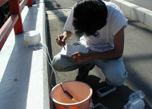 これは、堰から採水してすぐに簡単な水質調査をしているところ。